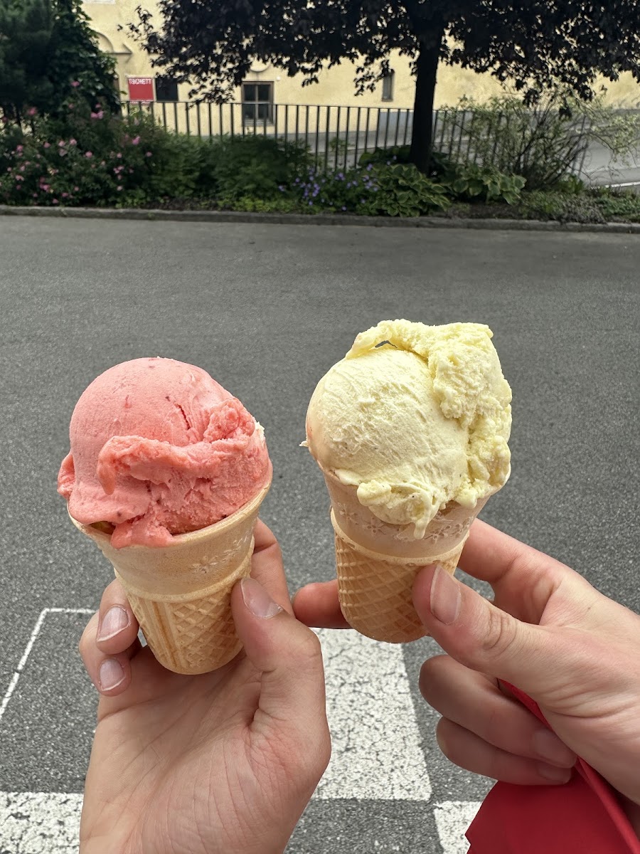 Door wat problemen met het betalen in een nabijgelegen parkeerplaats hebben wij hier in de tussentijd wat gedronken en gegeten (cappuccino + bananensplit ijsje). De service is super goed, de lieve behulpzame vrouw wilde ons graag helpen met het oplossen van de problemen met betalen bij de parkeerplaats. Super lekker ijs en een erg lekkere cappuccino! Zeker een aanrader